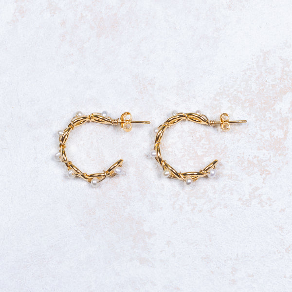 Andréa, our delicate open hoops braided with gold and freshwater pearls.