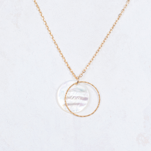 Léonore, our mother-of-pearl pendant arrounded with delicate details gold halo on a simple chain. Handmade in our Parisian workshop. 3 microns gold-plated and water resistant. Available in small mother-of-pearl.