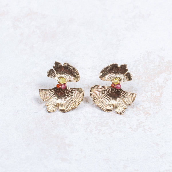 Victoire, nos boucles d'oreilles au détail floral et parées de pierres de tourmaline, péridot et garnet.