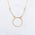 Edwin, notre collier composé d'une chaîne relevée de perles d'eau douce reliées à un anneau irisé.