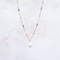 Henri, notre collier composé d'une fine chaîne parée d'une croix nacrée et entourée de pierres naturelles.