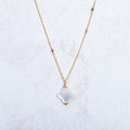 Henriette, notre collier composé d'une fine chaîne avec un trèfle nacré et entouré de pierres de soleil, de tourmaline, d'aventurine, de péridot, de grenat et de cristal rose.