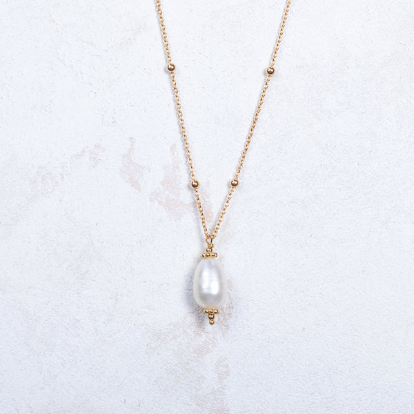 Prune, notre collier composé d'une perle d'eau douce ovale montée sur une chaîne perlée.