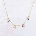 Stéphanie, notre collier paré de pampilles de perles d'eau douce, de rubis, de lapis lazuli et de péridot.