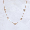 Justine, notre collier composé d'une délicate chaîne agrémentée de cinq petites fleurs dorées.